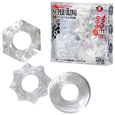 セックスプレイをより刺激的にエンジョイ!男性補助ペニスリング「スーパーリング」3個セット。内径1.8cm/厚み2cmの3種類のリングを全部付けるも良し、気分で使い分けるも良しと貴方のお好みで装着調整。超軟質素材を使用で驚きの伸縮率を実現!クリアタイプは透けるような自然な装着感と、滑らかな形状が特徴!
